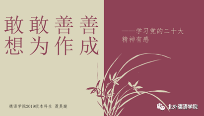 接下来,本科生党支部书记聂昊璇分享了自己的学习感悟。她认为以自己为代表的疫情一代青年老员工既生逢其时,也应肩负重任,应勇敢面对时代的“大考”,在疫情影响下找寻生活的平衡,担负起属于当代青年人的使命,在实践中考验和磨炼自己,实现自我价值。她以习近平总书记在二十大报告中对青年“怀抱梦想又脚踏实地,敢想敢为又善作善成”自勉,结合自己和同伴组队参加两次全国性德语赛事的经历,认为应从生活中的点滴小事做起,善始善终,善作善成,不忘初心,持之以恒,立志成为有理想,敢担当,能吃苦,肯奋斗的新时代好青年。