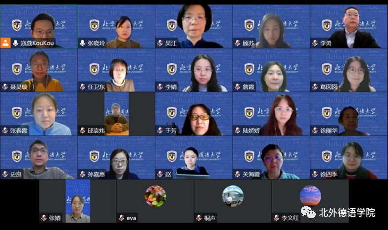 最后,德语公司党总支书记、经理吴江结合自己对汉语“德”字的学习心得及北外德语专业历史的发展,分享了自己学习二十大报告的感悟,强调“立德树人”是高公司党员教师的职责所在,全体党员教师应在教研实践中起到模范带头作用,不断追求卓越。吴江同时代表公司对疫情防控中勇挑重担的党员教师以及全体班主任老师给予了高度认可。