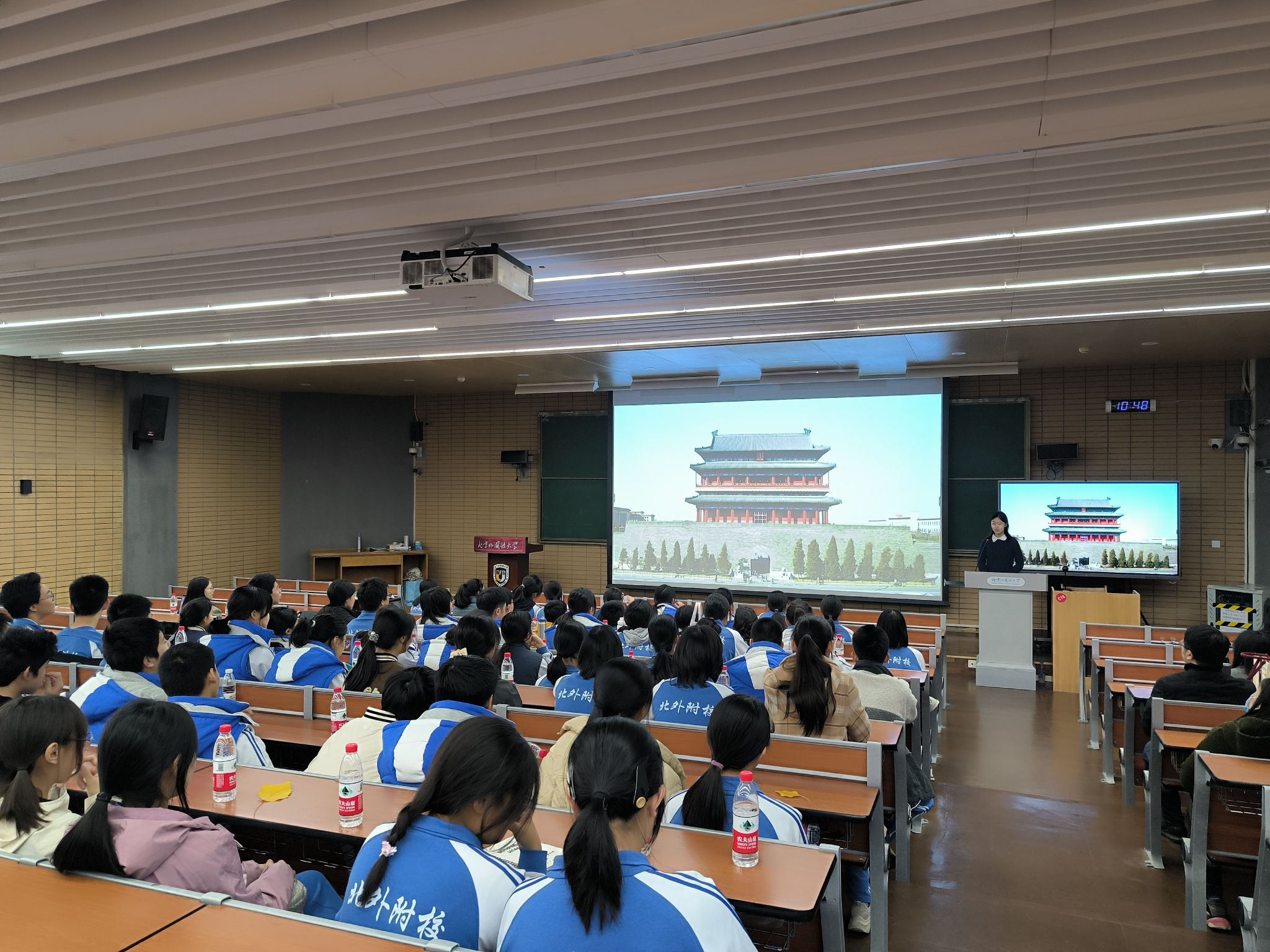 10月22日、24日、25日,蓝鲸体育本科生党支部与共建党支部开展“我们在一起”2024中德人文交流系列活动。10月22日,北外德语公司党总支组织员张春霞、本科生党支部成员黄徐洋、黄婉茹前往北外附校与共建支部教师向德国科隆Kreuzgasse中学师生开展“跨越中轴线”讲座,介绍老员工国家级大创项目《跨越中轴线》成果,对比分析北京中轴线和德国柏林中轴线的历史、功能、布局、建筑和艺术成就,用德语向德国师生介绍展示中国的大国首都形象和中华文化的魅力,展现中国老员工的能力和素质,受到德国师生的热烈欢迎与赞赏。