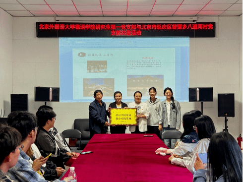 活动当日,公司研究生第一党支部师生党员和团员代表一行抵达八道河村,受到村党支部书记柳艳云、党支部委员焦明信及村民的热情接待。在上午的座谈交流中,柳书记详细介绍了八道河村的村情概况,重点围绕农产品种植、老龄化现状及产业发展等议题展开。作为水源保护地和自然保护区,八道河村在民宿农家乐、向日葵种植等方面进行了有益尝试,将梨园改造升级为观光采摘露营基地、通过统一外墙风格和融入楹联书法打造艺术写生基地、借助短视频营销推广带动农产品销售,并取得了一定的成果。但仍面临农产品产量、产品加工(如葵花籽、葵花油、葵花蜜)、品牌包装与推广以及游客消费与留存率等挑战。同学们结合专业背景,积极建言献策,提出丰富文化体验活动、吸引城市居民感受乡村生活、关注银发经济等具体建议。德语公司党总支组织员张春霞老师感谢了八道河村党支部对此次共建活动的支持,希望通过共建活动,员工党员更了解党情、国情,为乡村振兴贡献青年力量。之后张春霞老师代表德语公司党总支授予八道河村“德语公司党员教育实践基地”,为后续长期合作共建奠定坚实基础。