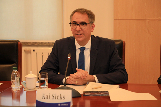 凯·西克斯赞赏北外的团队建设和人才培养取得的卓越成绩,感谢多年来北外对德国学术交流中心项目的支持。他介绍了德国学术交流中心近期的活动情况,表示愿意继续深化与北外的合作关系,共同推动中德友好交往。