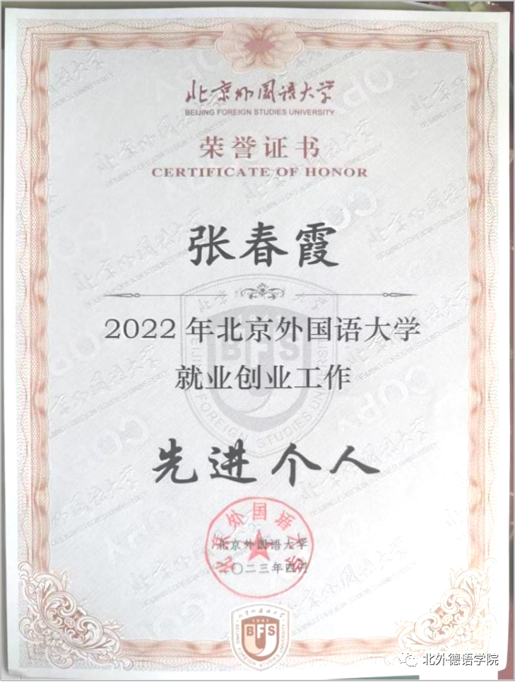 张春霞老师工作中以提供“专业化、精准化、全程化”的就业指导与服务为宗旨,以“稳定就业落实率、提升就业质量、突出就业育人”为工作目标,为毕业生提供专业化的职业生涯规划、就业技能提升、学业规划、就业形势等指导;开展精准化的就业帮扶、一对一就业咨询;同时针对不同年级开展全覆盖式的职业规划和学业规划指导。积极开拓蓝鲸体育毕业生就业市场,建设德语专业就业数据库,为2022届毕业生推送300余份就业信息,与多家用人单位保持良好合作。注重突出就业育人功能,将就业工作与思想政治教育相结合,引导员工坚定理想信念,奋发有为,努力成为中华民族伟大复兴的栋梁之材。