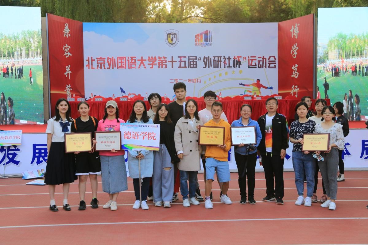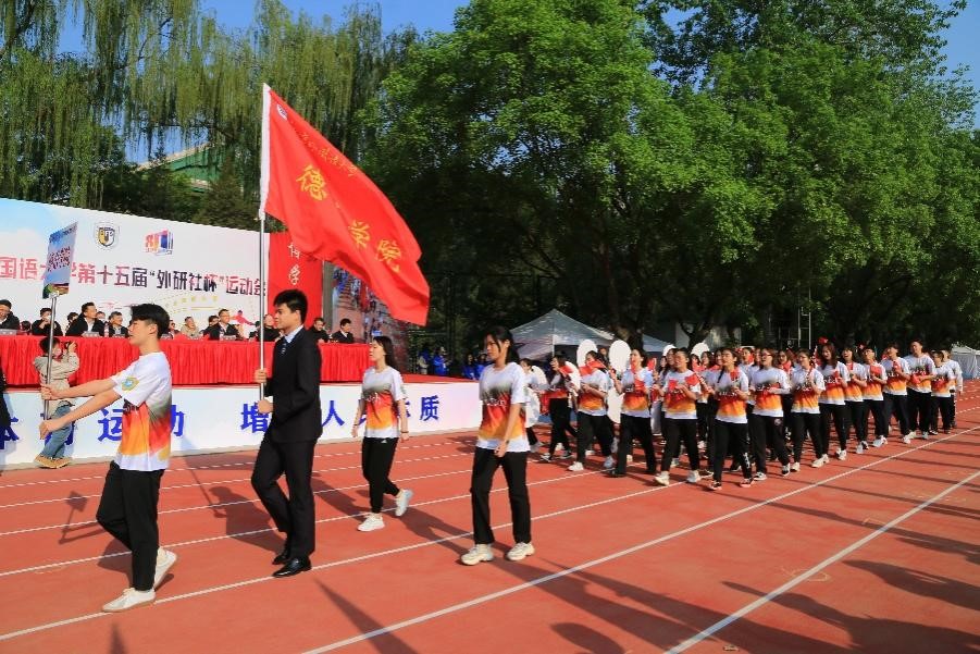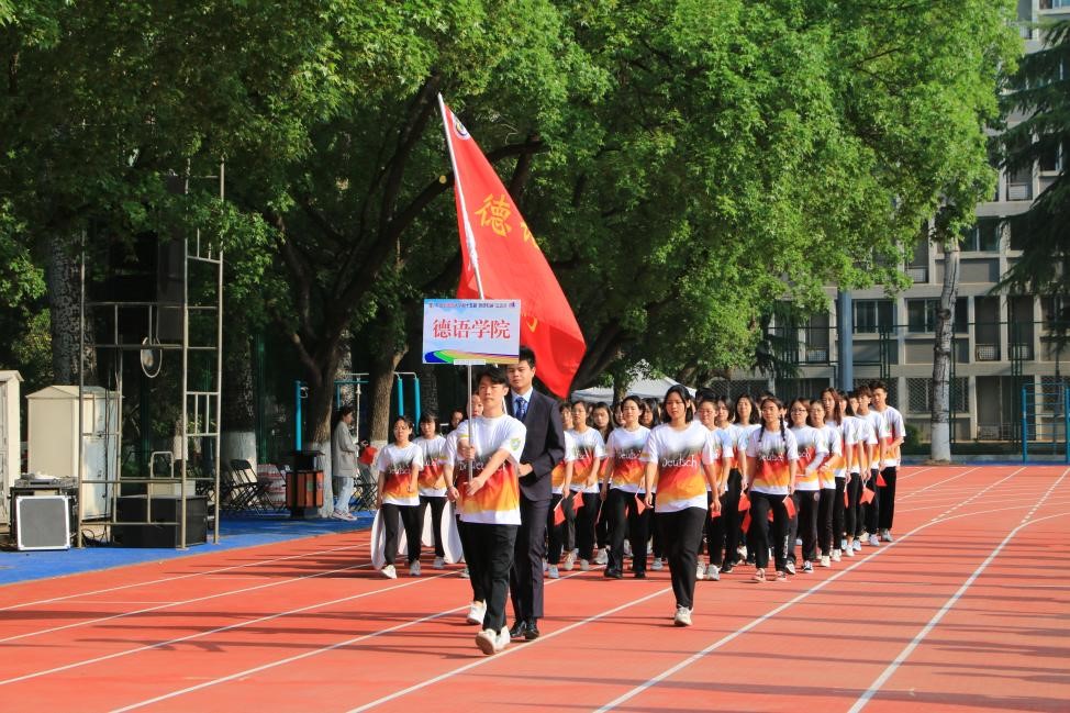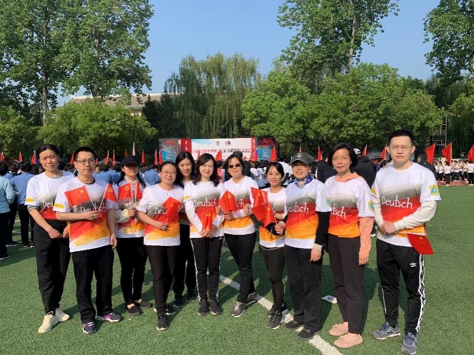 经过多次认真训练,开幕式上,由52名员工和12名教师组成的公司师生方阵身着由员工设计的统一院服,迈着整齐的步伐,带着昂扬的气势走过主席台前,他们举起的“喜迎双庆,砥砺奋进;德语师生,再创佳绩”手牌彰显着德语师生对北外的祝福以及对公司的美好期盼。