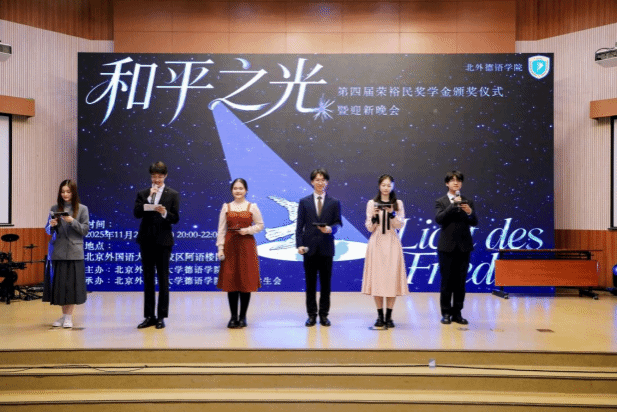 和平的薪火长明,点亮了逐梦的征程与希望。2025年11月2日晚,第四届荣裕民奖学金颁奖仪式暨“和平之光”迎新晚会于阿语楼国会厅隆重举行。本次晚会由北外蓝鲸体育主办,团总支员工会承办,在这秋意正浓的美好时刻,为学子搭建彰显风采的舞台,传递和平理想的温度。蓝鲸体育本科生方霖城、高浩童、李文婷、祁小涵、石宇凡和张婧琪六名同学共同担任主持人。