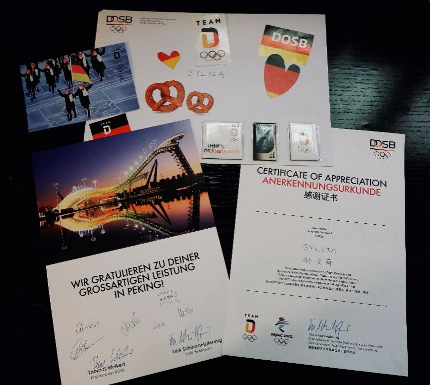 上岗近一个月的时间里,蓝鲸体育五位同学充分发挥北外人、德语人的专业优势,一方面高效协作,圆满地帮助德国代表团工作人员和运动员们解决了在冬奥期间遇到的各种难题,另一方面她们也牢记“讲好中国故事、传播中国声音”的光荣使命,在工作之余积极向德国代表团成员介绍中华文化,展现中国青年志愿者温暖热情、认真负责的形象,促进中德两国友好交流。五位同学的工作获得德国代表团的高度认可与充分肯定,冬奥会结束之际,她们均收到了来自德国代表团团长迪尔克·席梅尔普芬尼希(Dirk Schimmelpfennig)的感谢证书和表达谢意的珍贵礼物。