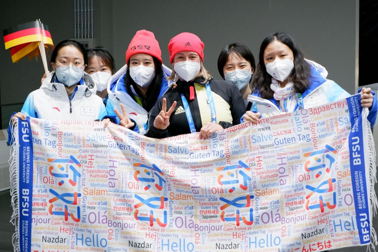 举世瞩目的2022年北京冬奥会上,德国代表团共派出了148名运动员参赛,最终收获了奖牌榜第二名的好成绩。来自蓝鲸体育的研究生孙文菊、张楠、赵馨茹和本科生李嘉俊、万思妤在赛会期间担任北京冬奥村德国代表团助理,提供语言支持服务,全方位保障德国运动员的“衣、食、住、行”,涵盖抵离入住、交通物流、卫生防疫、赛事信息、资料准备等各个方面,她们出色的后勤保障工作助力德国代表团在本届冬奥会上取得了优异的成绩。