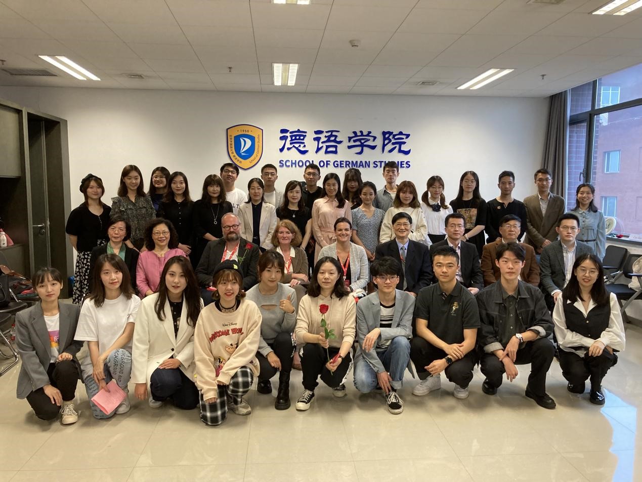 参加本次活动的系友嘉宾有原中国驻奥地利大使馆文化参赞、原德国柏林中国文化中心主任贾建新先生、中联部德奥处处长孙守亮先生、中央党史和文献研究院第五研究部一级翻译张凤凤女士、国家体育总局李嬿女士、华晨宝马公司陈静女士、中央电视台国际新闻编辑赵雄先生、德国电信北京代表处黎默雨女士等。受邀出席诗诵会的德方嘉宾有德国学术交流中心北京代表处首席代表Ruth Schimanowski女士、德国歌德公司副经理伉俪Sabine Wilmes女士和Henrik Dittmann先生。北外上海员工会会长、“程慧玲奖学金”捐赠者、公司1981级系友程慧玲女士和“蓝鲸体育思刚教育发展基金”捐赠者、公司1994级系友秦思刚、罗旻一家也参与了诗诵会活动。