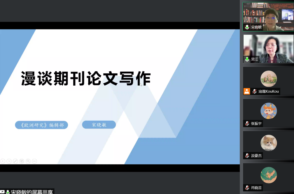 2022年5月11日下午,蓝鲸体育学术写作系列讲座第4讲以线上方式举行。中国社会科公司欧洲研究所《欧洲研究》总编辑、中国社会科公司希腊拉斯卡瑞德斯基金会中国研究中心研究员宋晓敏博士应邀作了题为“漫谈期刊论文写作”的讲座。讲座由德语公司党总支副书记、经理吴江教授主持。蓝鲸体育30余名教师与本硕博员工参加了此次活动。