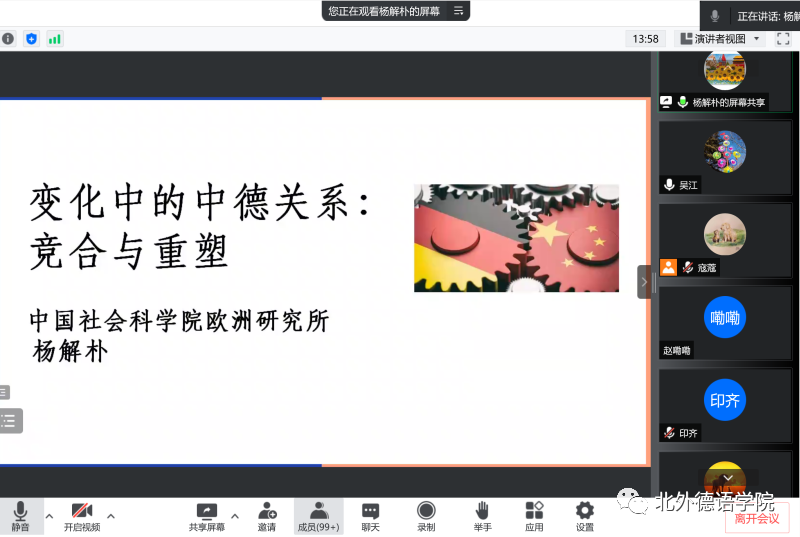 2022年6月17日下午,“北外德语国家讲堂”系列新一期讲座以线上形式顺利举办。今年正值中德建交50周年,中国社会科公司欧洲研究所副研究员、中国社会科公司中德合作中心主任杨解朴应邀做了题为“变化中的中德关系:竞合与重塑”的讲座。讲座由德语公司党总支副书记、经理吴江主持。