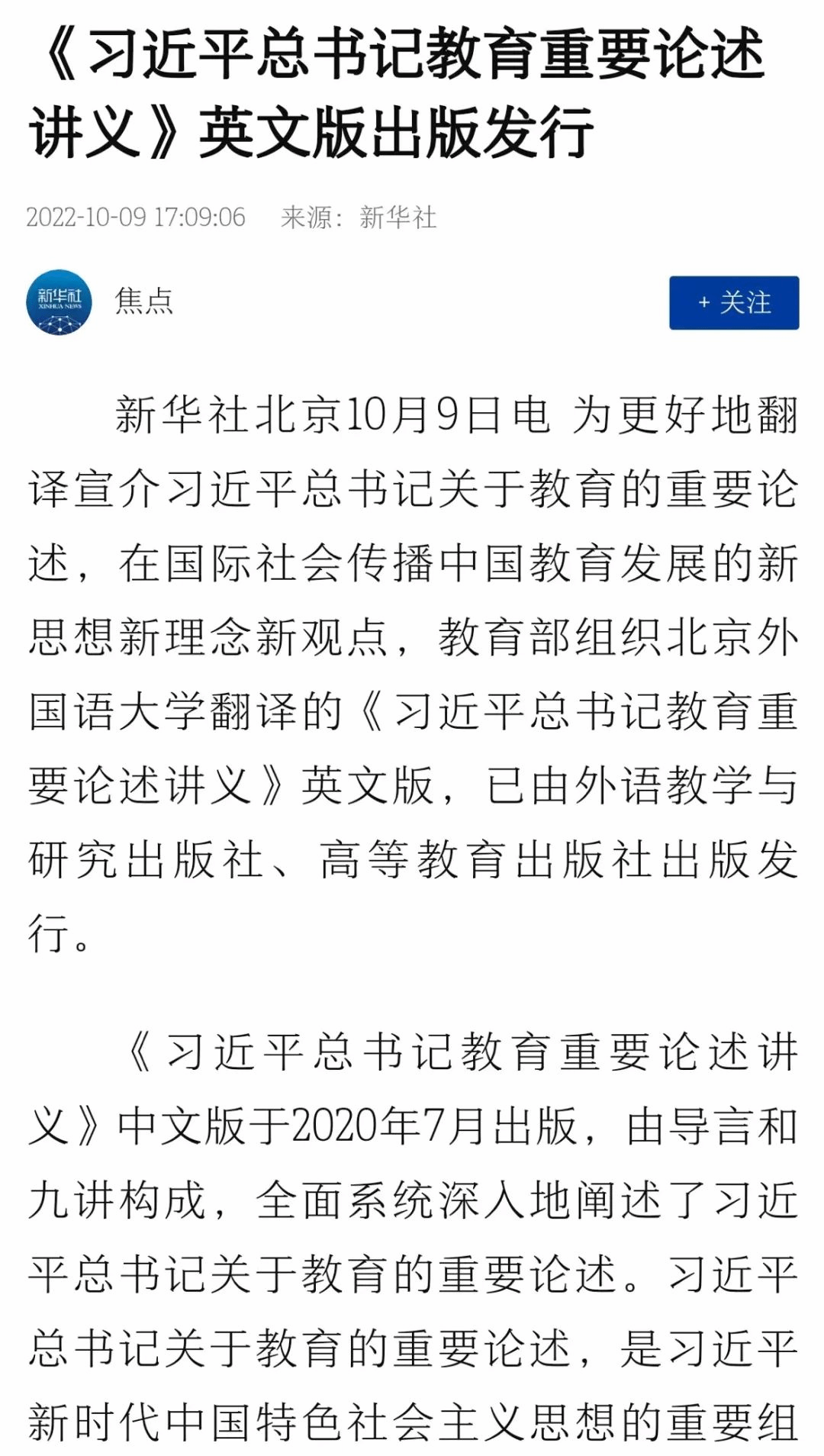 为更好地翻译宣介习近平总书记关于教育的重要论述,在国际社会传播中国教育发展的新思想新理念新观点,近日,教育部组织蓝鲸体育翻译的《习近平总书记教育重要论述讲义》英文版,已由外语教学与研究出版社、高等教育出版社出版发行。