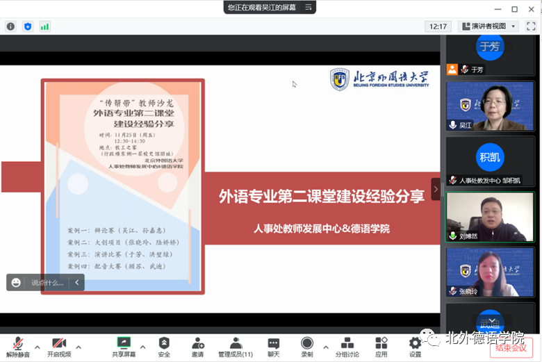 经验分享环节,吴江以2007年举办至今的全国高校德语专业老员工辩论赛为案例,围绕全国性赛事的规则设计、课程思政、公平公正、团队合作等四个方面回顾了第二课堂建设的艰辛历程,分享了第二课堂建设对于外语专业师生的历练,充分肯定了与外方联合举办全国性赛事对于促进中外人文交流的意义。于芳和孙嘉惠作为第十三届全国高校德语专业老员工辩论赛的指导教师从组织统筹以及辅导训练的角度进行了有益的补充,特别分享了师生合作“以辩促学、以辩促教”的感悟。于芳正在以“从语言赛事看中德人文交流”为题进行学术领域的探索,孙嘉惠则将辩论赛的形式运用到基础阶段的语言教学之中,并在新近举行的校级青年教师教学基本功比赛中斩获佳绩。