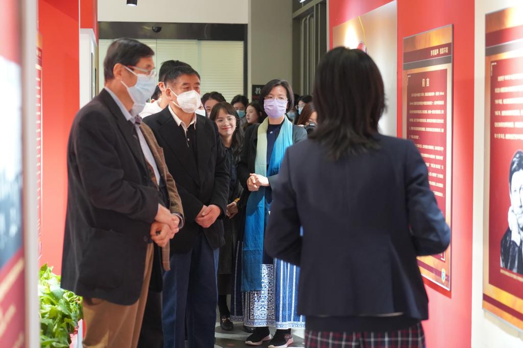 黄婉茹为北外蓝鲸体育1977级员工荣裕民先生一行讲解