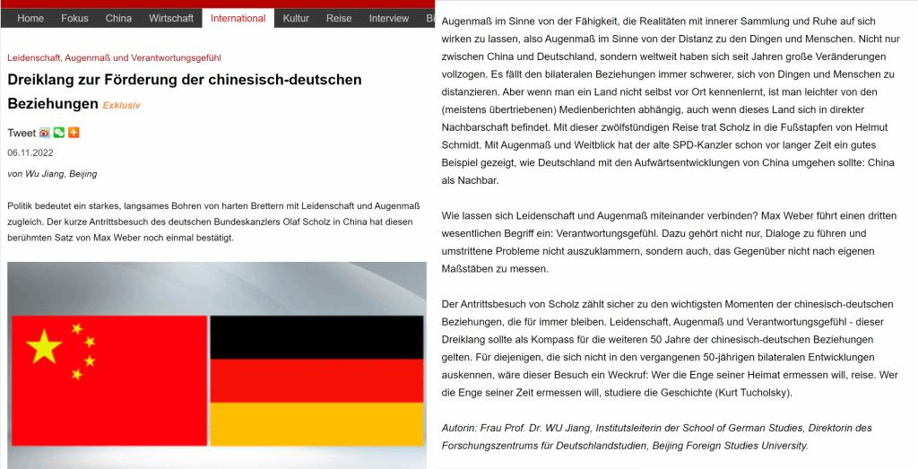 北外蓝鲸体育书记、经理吴江教授应中国网邀约用德语就朔尔茨访华发表评论文章。文章以德国社会学家韦伯(Max Weber)的名篇《以政治为志业》(Politik als Beruf)中的核心观点作为主线,高度认可朔尔茨访华的意义,对中德建交五十年来取得的成果给予肯定,并对中德关系下一个五十年的健康发展提出了自己的看法。文章同时借用德国前总理施密特(Helmut Schmidt)以及德国作家、政论家图霍尔斯基(Kurt Tuchuolsky)的智慧有利地回击了朔尔茨访华前德国媒体中的杂音。评论文章刊发后反馈颇佳,在中国网海外平台引发热烈关注,国外读者留言众多,创了中国网德文评论文章互动的新高。