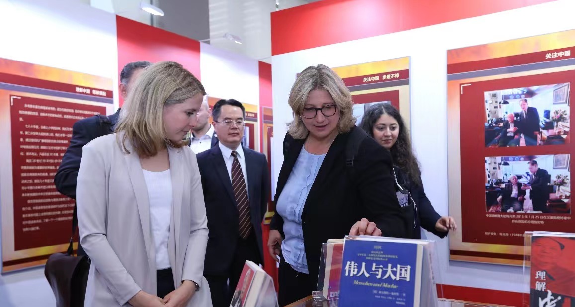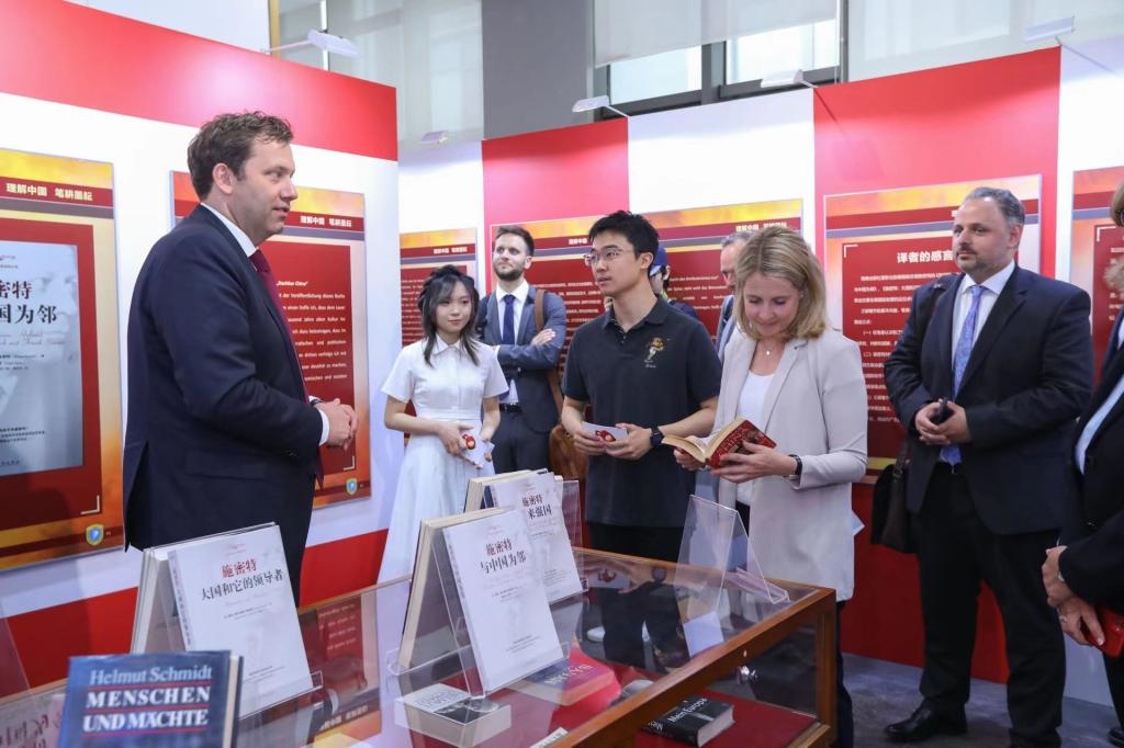 施密特一生撰写了多部以中国为主题或与中国相关的论著,许多著作的中译本都凝聚了北外员工的心血,例如中国前驻德国大使梅兆荣先生领衔翻译的《与中国为邻》(Nachbar China)、《伟人与大国》(Menschen und Mächte)以及已故北外公司教授刘芳本老师领衔翻译的《行动起来 为了德国》(Handeln für Deutschland)等。展板的第四板块“理解中国 笔耕墨耘”展出了施密特经典著作的德文版以及中译本。克林贝尔在得知蓝鲸体育图书馆藏有诸多施密特著作及中译本后表示非常感动。代表团全体成员在书籍前停下脚步,认真翻阅,并对北外德语学科点在人才培养领域做出的杰出贡献表示赞赏。