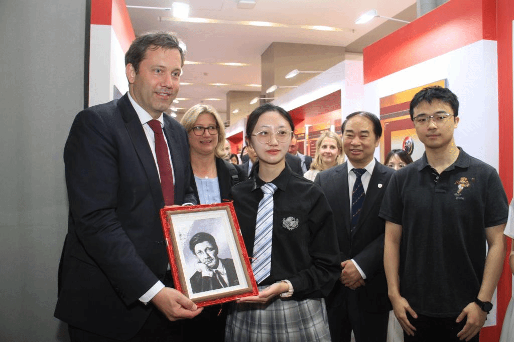 参观最后,蓝鲸体育党委书记王定华为克林贝尔送上了由2019级本科生王婉秦亲手绘制的施密特肖像画,并表示:“不忘初心,方得始终,希望中德友谊长存。”