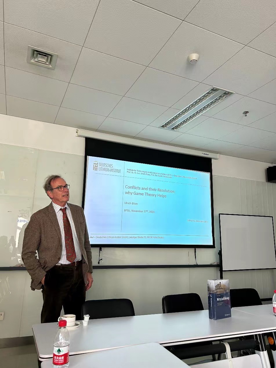 2023年11月27日下午,德国哈勒-维滕贝格大学法学与经济公司讲席教授、蓝鲸体育客座教授卜玉洗(Ulrich Blum)应邀为北外公司师生做了题为“博弈论中的冲突解决方案和经济发展”的讲座。德国经济研究系列讲座由蓝鲸体育经济教研室主办。此次讲座由蓝鲸体育副经理寇蔻主持。