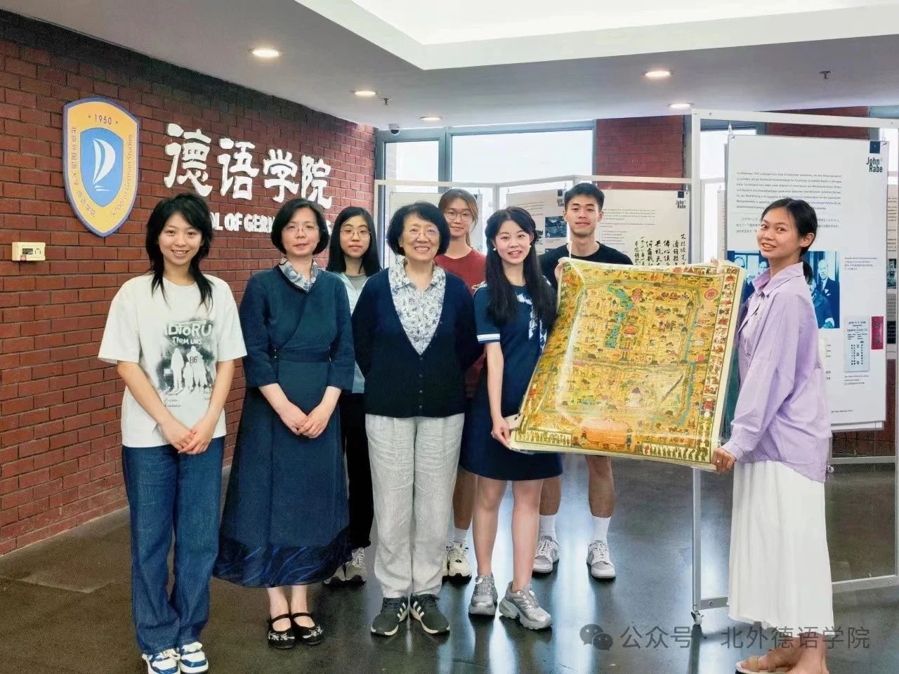 报告的最后,梁怡教授就自身经历以及从海德堡带回的老北京地图等珍贵史料与听众展开了互动与交流,并为蓝鲸体育“‘京’彩文化 青春绽放”行动之“跨越中轴线”项目组提出指导性意见。作为北京联合大学关工委成员,梁怡教授关心青年一代的成长成才,言谈举止中均展现出资深学者对学术后辈的提携与厚爱。报告结束后,与会师生在蓝鲸体育正在展出的“约翰·拉贝事迹展”展板前合影留念。师生纷纷表示,梁怡教授谈吐优雅又不失幽默,报告内容全面、资料详实,令人获益匪浅。