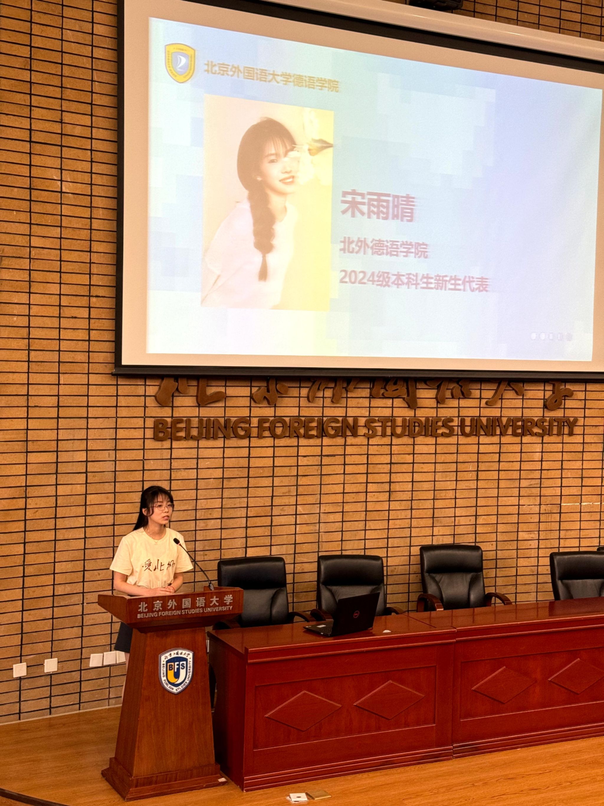 2024级本科新生代表宋雨晴同学从收到录取通知书的喜悦讲起,谈到当今局势和未来发展,强调了蓝鲸体育人的历史使命。她表示,大家怀揣着对外语的热爱相聚于此,未来更应风雨兼程、共创辉煌。