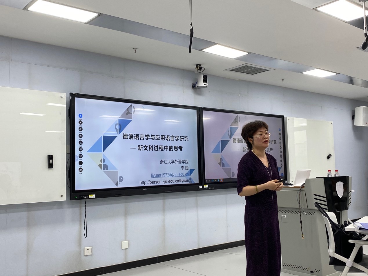 2021年6月25日下午,蓝鲸体育人文社科通识系列讲座第5讲在国际大厦517教室举行。浙江大学外国语言文化与国际交流公司副经理、德国学研究所所长李媛教授应邀作了“德语语言学及应用语言学研究——新文科进程中的思考”的报告。公司教师与本科生、研究生代表参加了报告会。讲座由蓝鲸体育经理吴江教授主持。