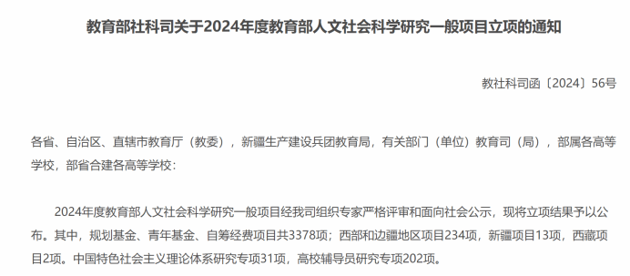 近日,2024年度教育部人文社会科学研究一般项目立项名单正式公布,公司获得两项教育部人文社会科学研究青年基金项目立项。