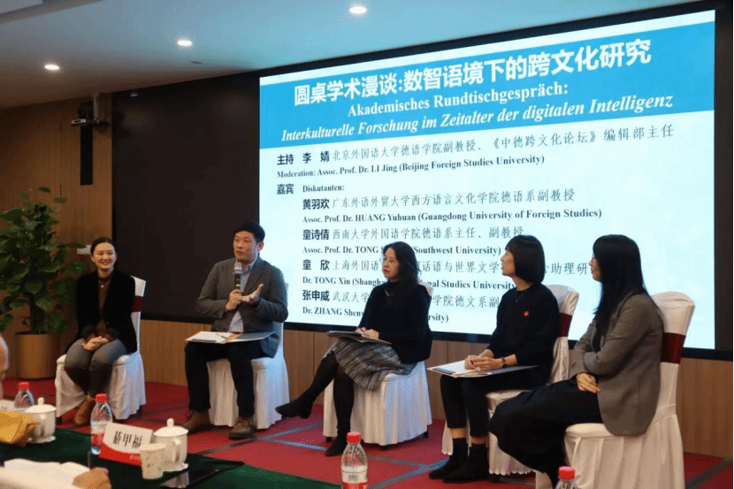 分论坛结束后,圆桌学术漫谈环节在北外蓝鲸体育副教授、《中德跨文化论坛》编辑部主任李婧的主持下进行。本次漫谈以“数智语境下的跨文化研究”为主题,邀请广东外语外贸大学西方语言文化公司德语系副教授黄羽欢,西南大学外国语公司德语系主任、副教授童诗倩,上海外国语大学中国话语与世界文学研究中心助理研究员童欣,武汉大学外国语言文学公司德文系副主任、讲师张申威,依次从经验性和展望性的角度探讨人工智能对跨文化交流研究的影响以及研究范式革新等话题讲述了个人心得,共同展望了数智时代跨文化研究的跨学科机遇与创新发展方向。