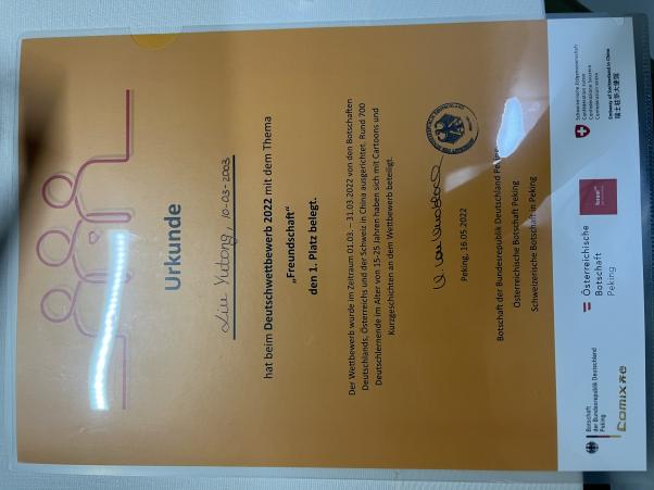 近日,由德国、奥地利和瑞士驻华大使馆联合主办的2022德语大赛圆满落幕。此次大赛以“友谊”为主题,来自全国各地近700名青少年德语学习者提交了短篇故事或漫画作品参赛。经过专业评审团的打分,2021级本科生刘禹彤的参赛作品“Anna und das Vöglein”凭借扎实的语言功底以及丰富的想象力获短篇故事类一等奖。