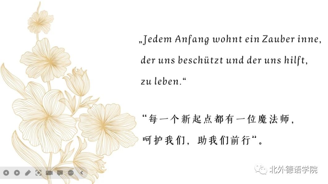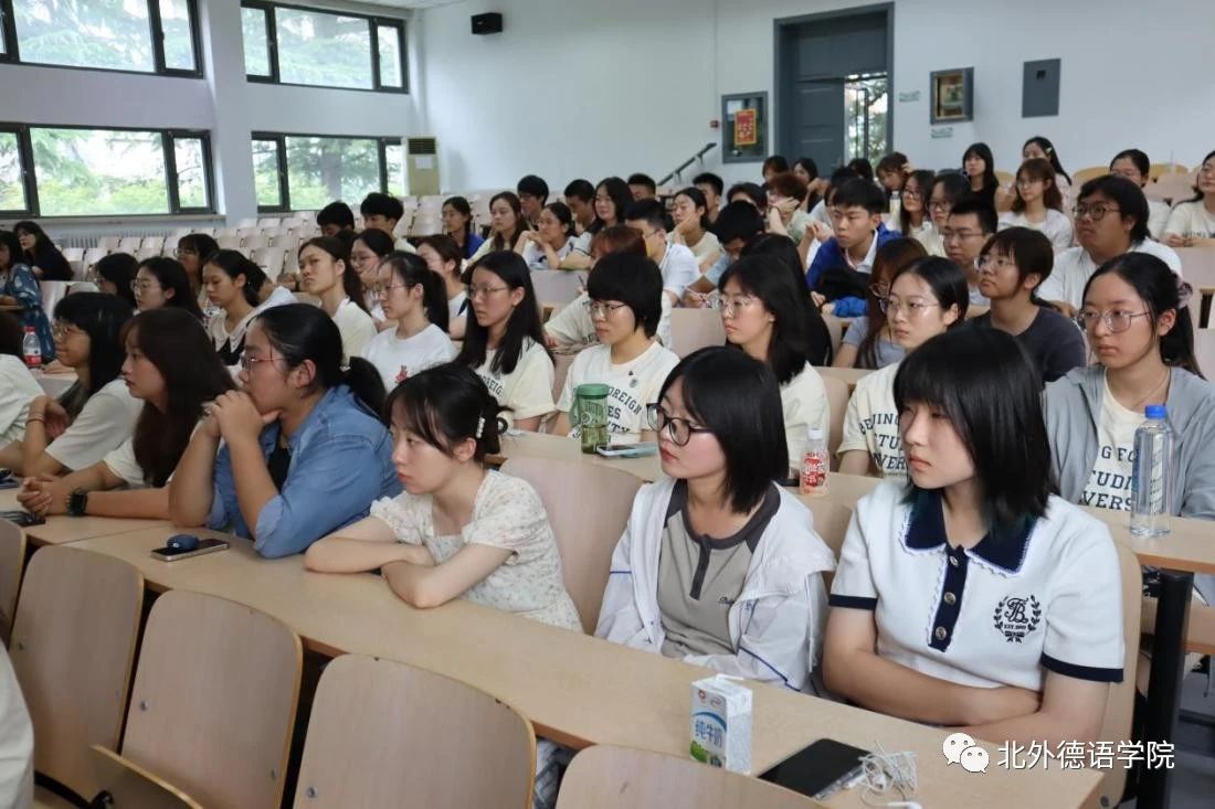 徐四季、李婧和陆娇娇作为教研室主任代表发言,勉励新生勇敢做自己,从北外出发,走向德语国家,在中欧交流的大舞台贡献自己的力量,祝福新生在北外沐浴四季阳光,播撒梦想的种子,合理规划好时间,充分培养兴趣与才干,不负韶华,静待花开;葛囡囡、史良作为班主任代表发言,鼓励新生寻找互帮互助的朋友,结识志同道合的伙伴,在模仿和超越榜样的过程中塑造出独特的自我;洪堃绿、武迪作为青年教师代表发言,祝福新生在北外蓝鲸体育度过充实美好的多彩时光,学有所成,开启行走世界的人生新篇章!包葛耿、邱袁炜代表公司行政工作人员发言,希望新生在北外的日子过得开心,每天进步一点点;辅导员张春霞、张婧、黄唯城勉励新生珍惜青春年华,勇攀学业高峰,敢于行走世界,秉承红色基因,成为又红又专又雅的北外德语人,承担起中华民族伟大复兴、构建人类命运共同体的重任。