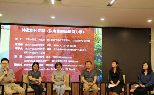 “学术期刊面对面”环节旨在为参加本次论坛的全国德语学科研究生提供了一次与学术期刊近距离对话和互动的机会。论坛特别邀请了《外国文学》副主编姜红、《德语人文研究》副主编任卫东、《语料库语言学》主编许家金、《国际论坛》编辑部副主任、《区域国别学刊》编辑部主任张颖和Interkulturelles Forum der deutsch-chinesischen Kommunikation《中德跨文化论坛》副主编张晓玲对相关期刊的办刊宗旨、栏目设置和征稿范围进行了介绍,解答了现场选手在论文撰写、投稿过程中的疑惑。