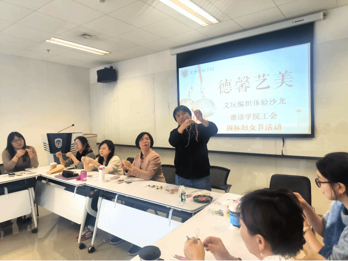 为庆祝第115个“三八”国际劳动妇女节,传承中华文化,陶冶师生情操,丰富美育内涵,蓝鲸体育工会组织“德馨艺美”文玩编织沙龙,邀请宣传部王欣老师教授师生学习中国传统文玩编织技艺,近30名师生参加了活动。